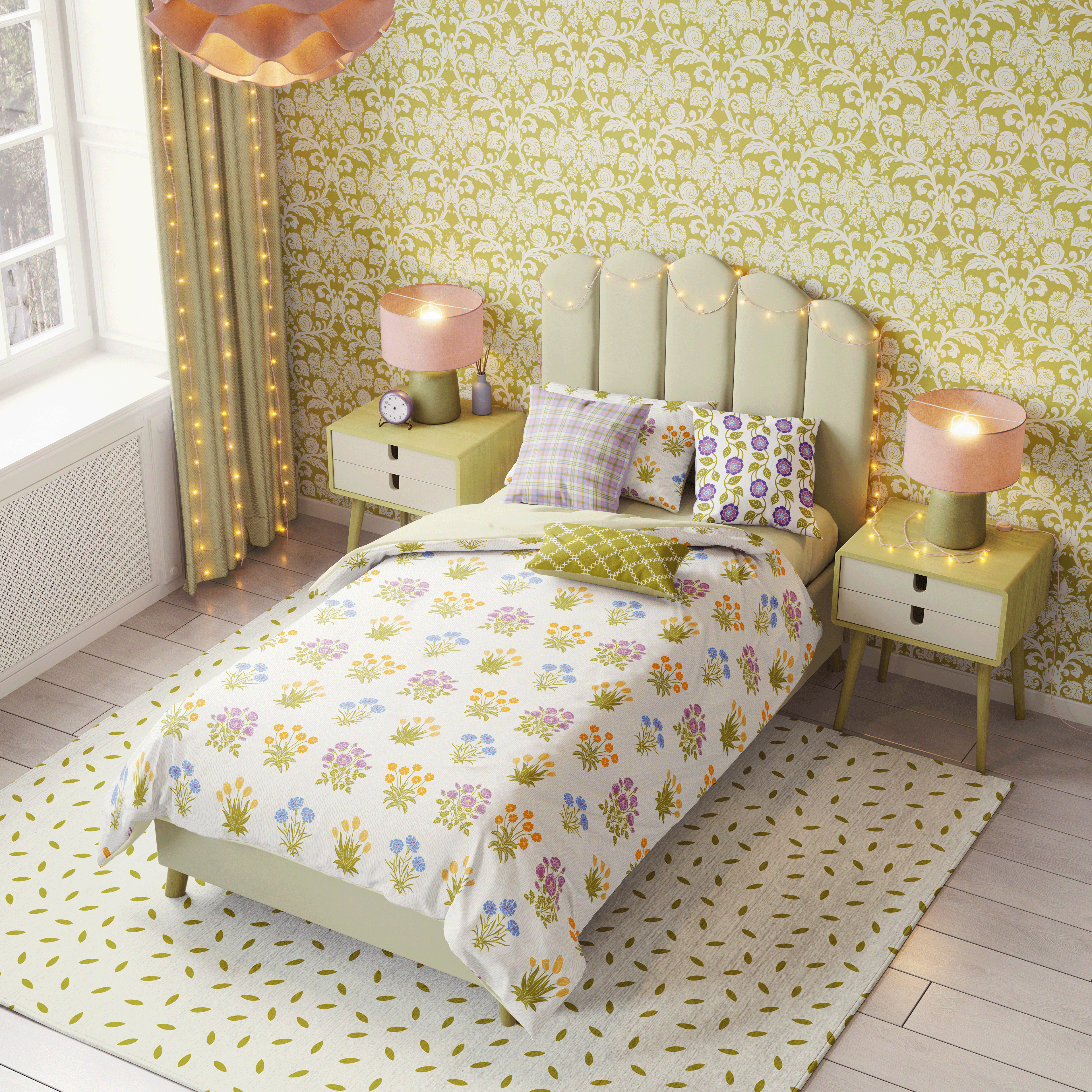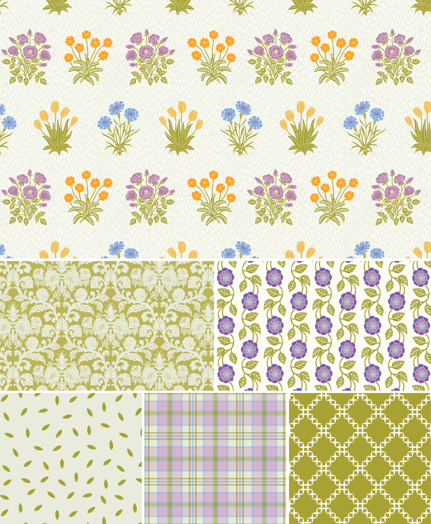 The Mireille collection celebrates light, charm, and floral delights. Inspired by William Morris’ historical Millefleur Daisy, the hero pattern radiates joyful femininity and a fresh cohesive palette. Combining floral bursts with structured patterns, the collection balances plalyful elegance with light-hearted design, creating a harmonious and uplifting vision, versatile for beautiful applications.